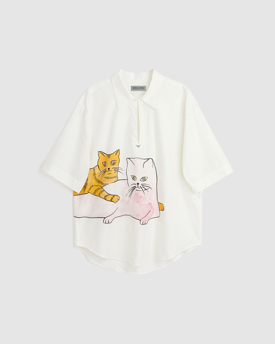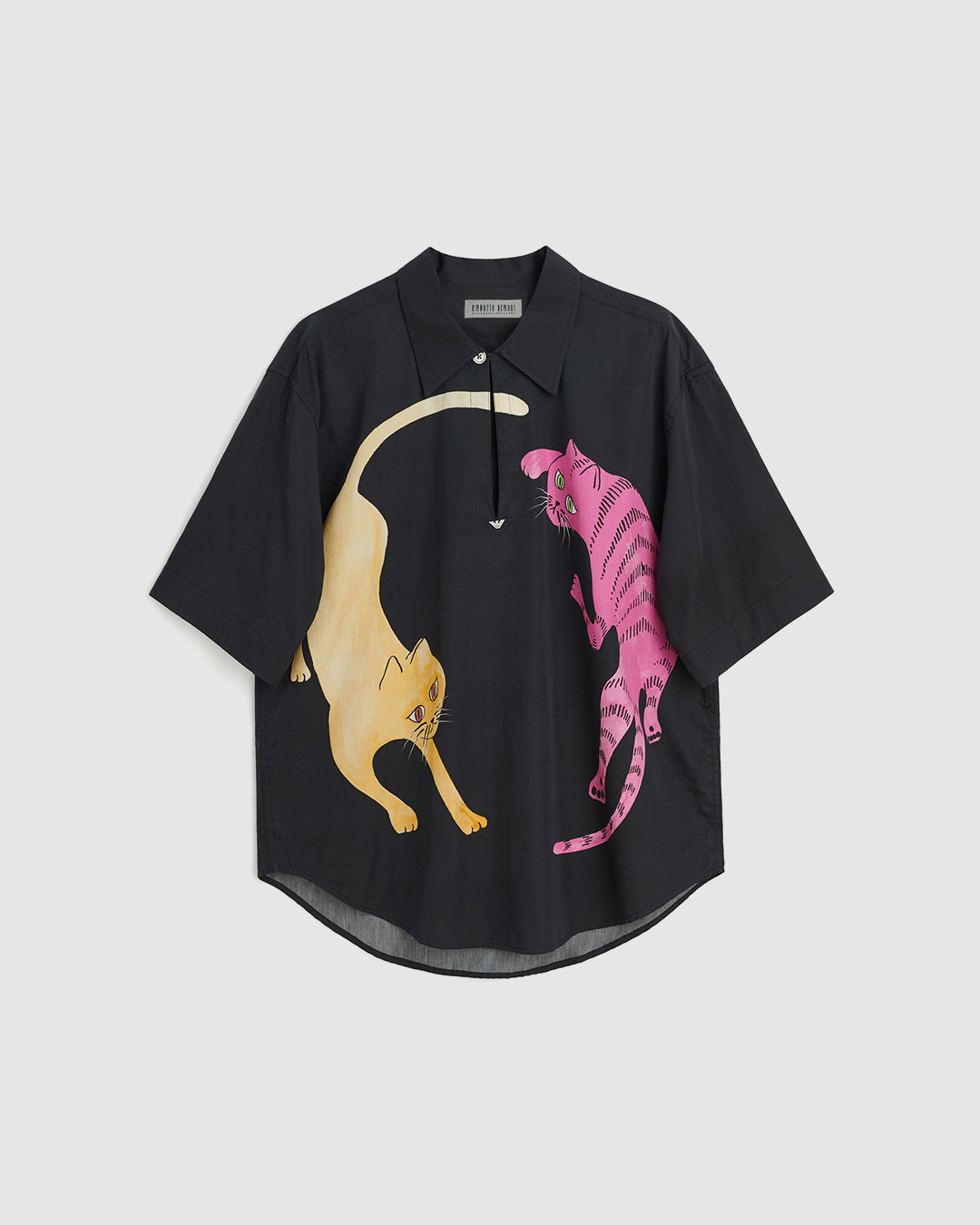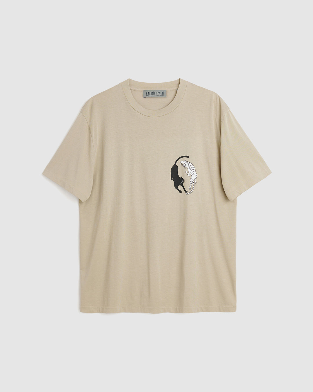 The menswear and unisex collection consists of sharp leather coats, heavy shearling flight jackets, soft tailored suiting, overcoats in textured wool fabrics, accessories, and striped, plaid and printed shirts. Corduroy, denim jeans and heavyweight jersey represent the more casual side of the collection. Cat prints featured throughout the collection are inspired by Giorgio Armani's special relationship with the animal.